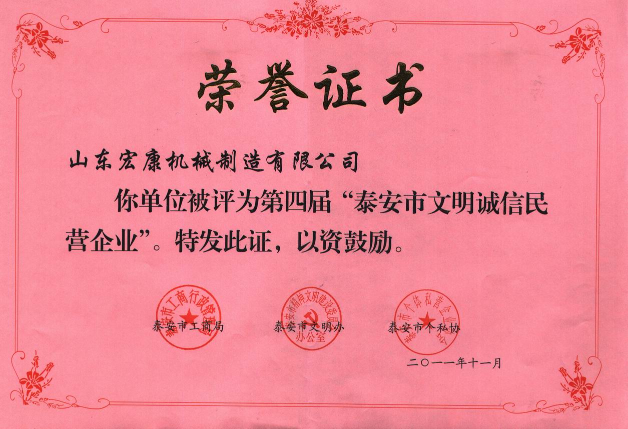 我集團(tuán)被泰安市工商局、市文明辦、市個(gè)體私營(yíng)企業(yè)協(xié)會(huì)評(píng)為“第四屆泰安市文明誠(chéng)信民營(yíng)企業(yè)”。
